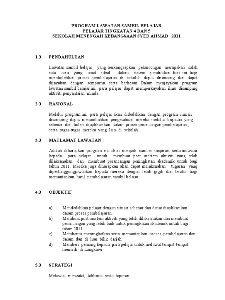 Doc Kertas Cadangan Program Lawatan Sambil Belajar Pelajar Tingkatan 5 Dina Deena Hanania Academia Edu